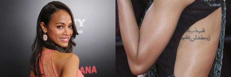 Тем не менее, некоторые открытые наряды, которые Салдана надевала на различные церемонии и вечеринки, позволили рассмотреть несколько наколок. Правую ступню и часть грудной клетки слева звезда украсила арабской вязью, на внутренней поверхности одного бедра фотографы разглядели таинственные инициалы. А еще две маленькие звезды уютно разместились на запястье и щиколотке актрисы.
