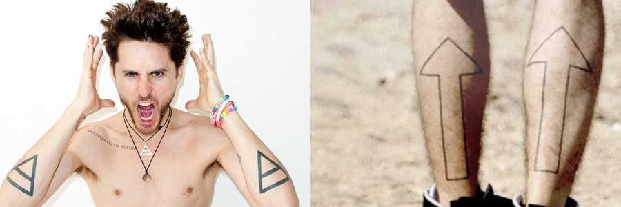 Лауреат премии Оскар, лидер группы 30 Seconds to Mars является обладателем крайне необычных татуировок. Самая знаменитая и наиболее узнаваемая наколка Джареда – переплетенные глифы на правом запястье – ассоциируется с его музыкальным коллективом. На левом предплечье исполнителя красуется еще одна геометрическая фигура: круг, внутри которого расположен крест. Все, кто в теме, знают, что это эмблема альбома A Beautiful Lie.