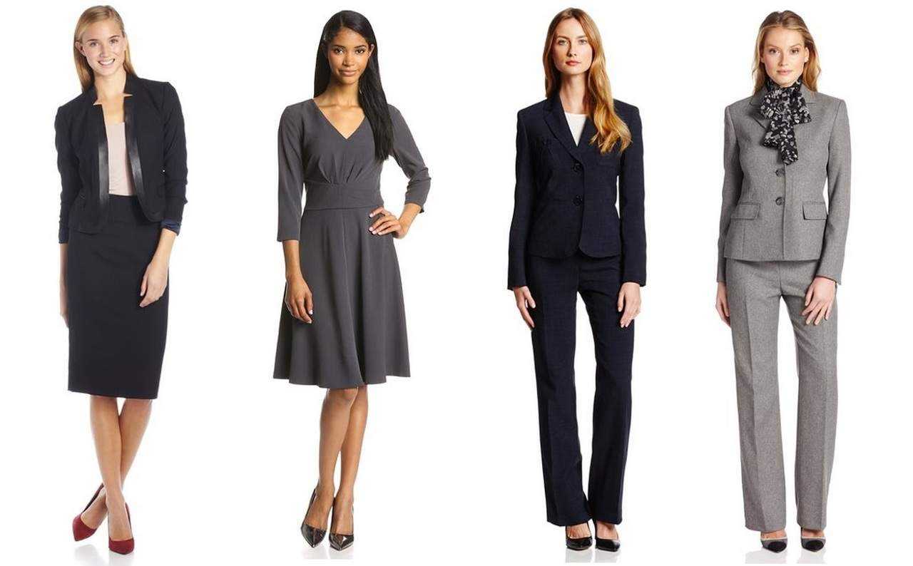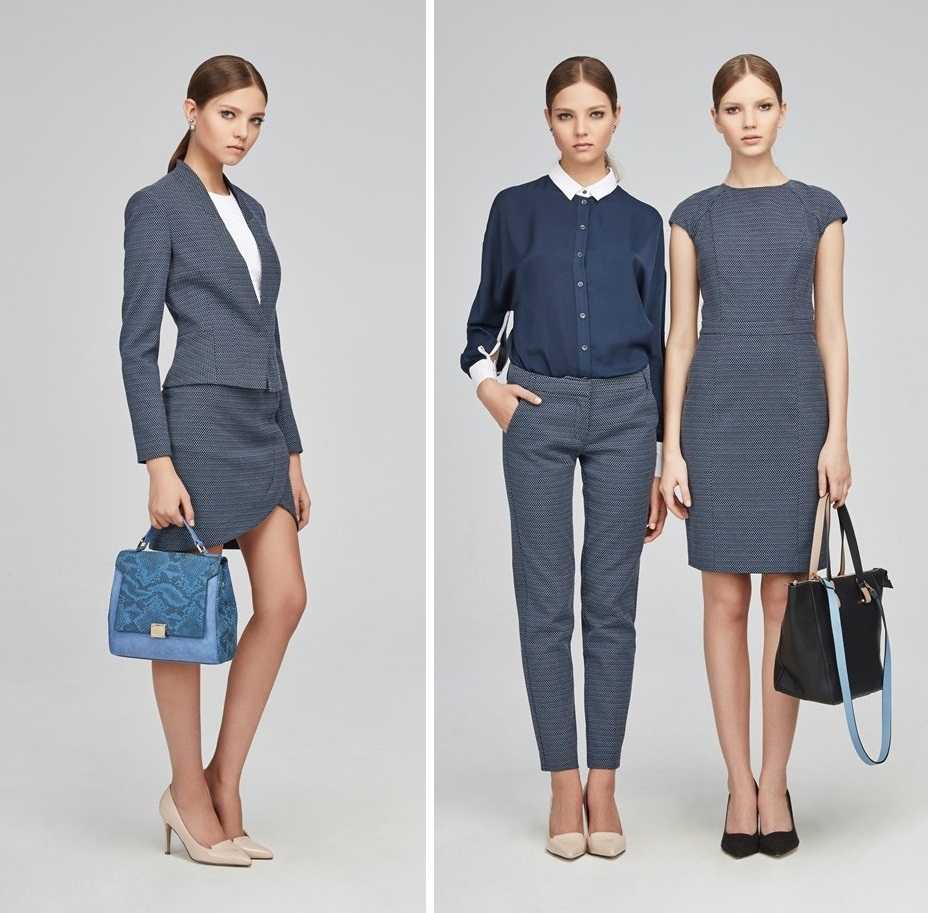 - Основу гардероба должны составлять классические костюмы, рубашки, деловые платья, юбки-карандаш и брюки.