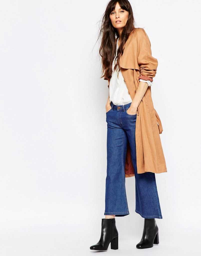 Длинный тренч можно носить с ботильонами и джинсами в рамках кэжуал-образов. Дополните лук трендовыми остроносыми ботильонами или моделью в необычном цвете (белом, сливовом, малахитовом, бордовом), чтобы добавить образу богемности. Лук будет выглядеть еще более спокойным и расслабленным, если подкатить джинсы или брюки.