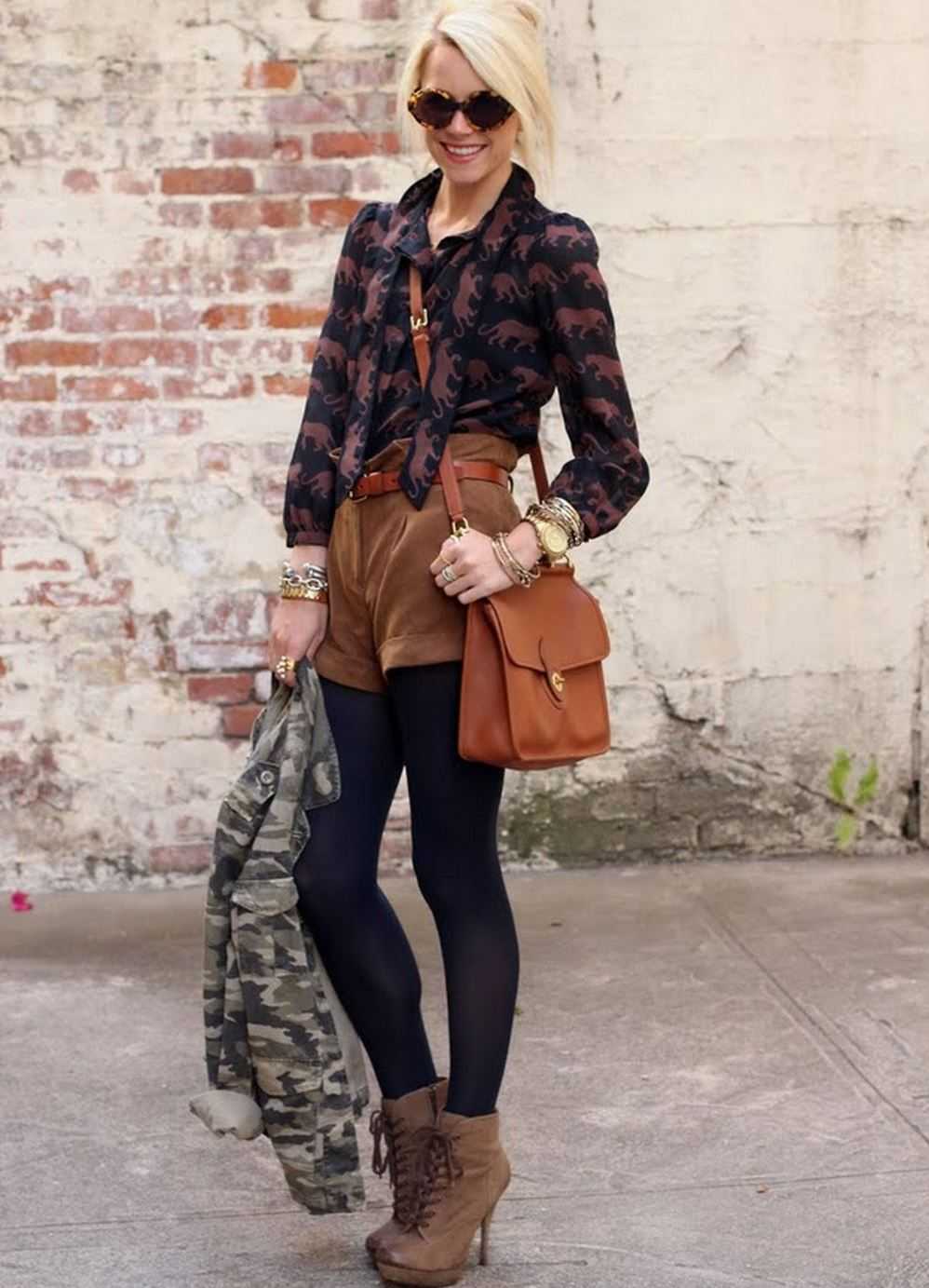 Данный вариант подойдет как раз для холодной погоды. Замшевые шорты всегда смотрятся роскошно и изящно. Особенно эффектно смотрятся модели с завышенной талией, если из сочетать с обувью на каблуках.