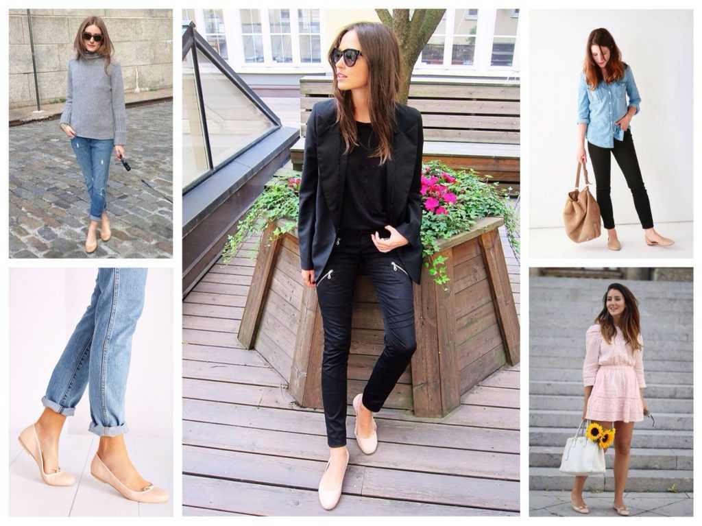 Рекомендации касательно того, с чем носить лодочки без каблука не сильно отличаются от советов по поводу варианта на шпильке. Стоит избегать их сочетания со спортивными костюмами и домашними нарядами, а со всем остальным такие лодочки носить можно.