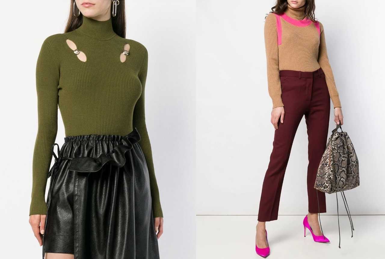 Тёплые свитера в этом сезоне поражают разнообразием фасонов и принтов. Приталенные модели с высоким горлом не позволят замёрзнуть в офисе.