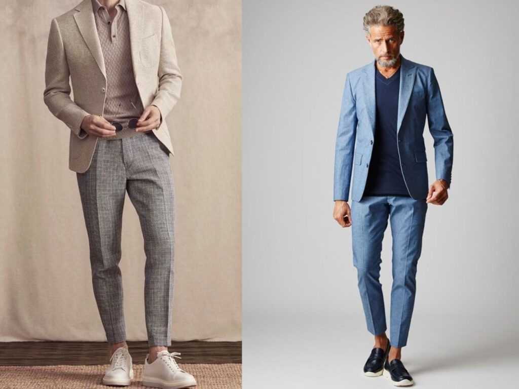 Можно носить костюмные брюки с рубашкой или с трикотажем. Также под пиджак можно надевать поло или однотонную футболку. Но если встреча имеет официальный формат, лучше одеться более консервативно.