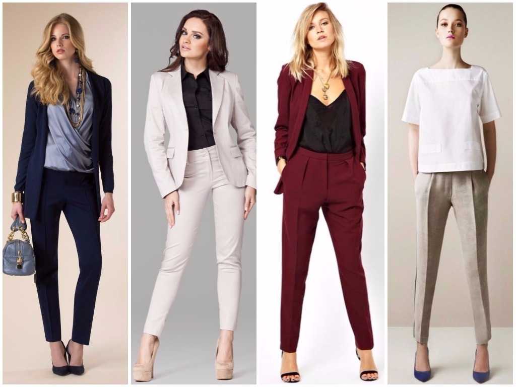 Брючные варианты также по-прежнему на гребне моды. Брюки могут быть со стрелками или укороченные, а пиджаки приталенные или свободно-удлиненные. Допускается включение в ансамбль качественной водолазки из натуральной ткани, плотной рубашки классического кроя.