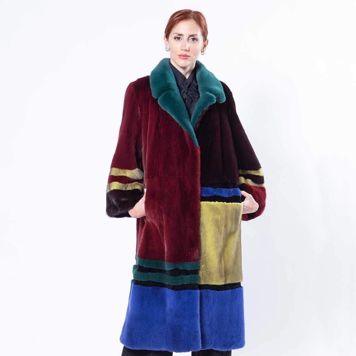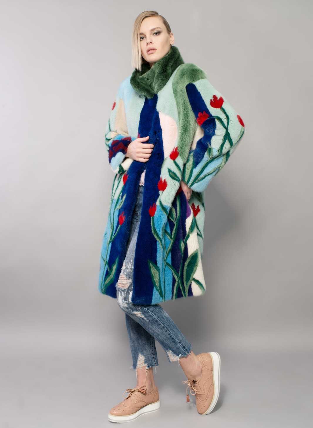 Смешение разных оттенков в технике пэчворк. Казалось бы, разноцветность и эклектический подход к цветовому оформлению может вызывать зрительный диссонанс. На самом деле, такая шуба смотрится очень стильно. Особенно в сочетании с джинсами и ботинками на каблуке. Образ в яркой многоцветной шубе получается задорным, динамичным, лёгким. Попробуйте носить такую шубу, если вы сторонница интересных решений в луках.
