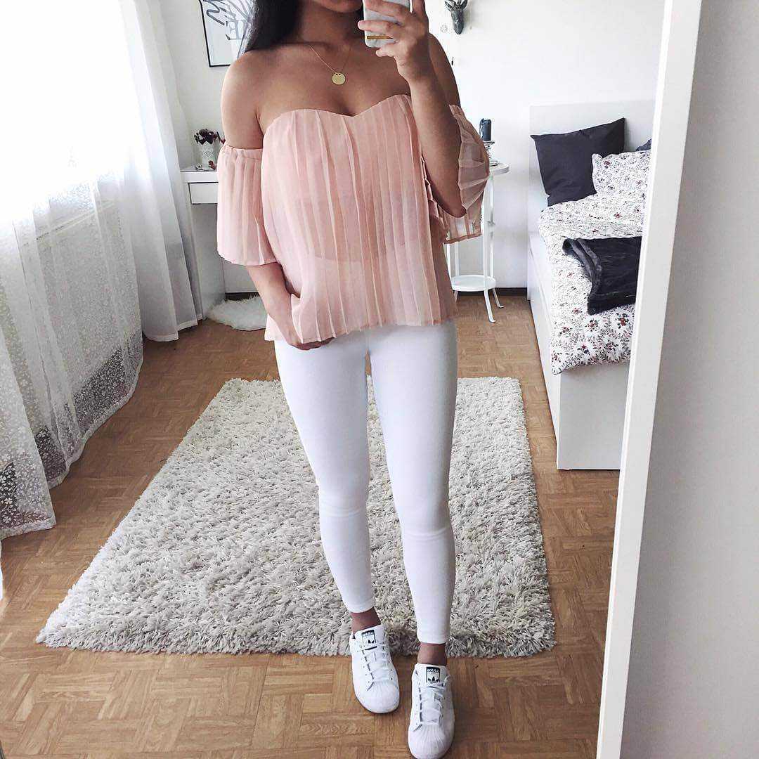 Плиссированная юбка в сочетании с топом, однотонной футболкой или нарядной блузой дополнит романтический образ. Для завершения его можно добавить изящную сумочку клатч и босоножки с тонкими ремешками на высоком каблуке. Романтично будет смотреться и плетёная сумка в паре с балетками или босоножками на низком ходу.