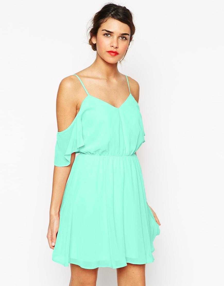 Еще один модный тренд лета – яркое платье с открытыми плечами. Выбирайте модные цвета и оттенки – ярко-оранжевый, бирюзовый, красный, лавандовый, синий.