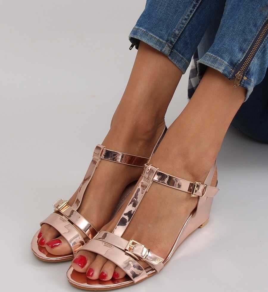 Розовый металлик на низком каблуке и обязательно с ремешками, чтобы быть в тренде. Такие босоножки украсят образ для прогулки, отдыха на набережной или даже в клубе.