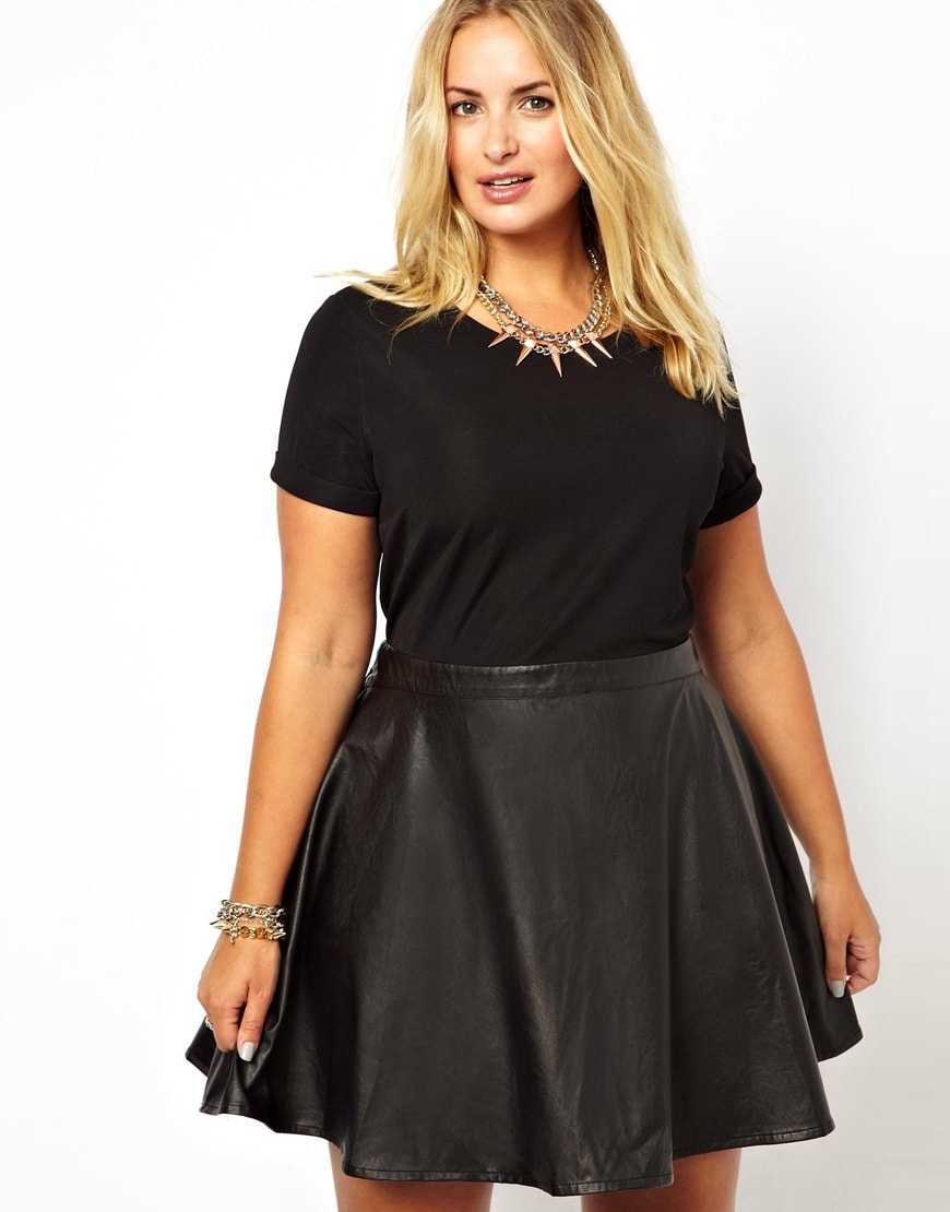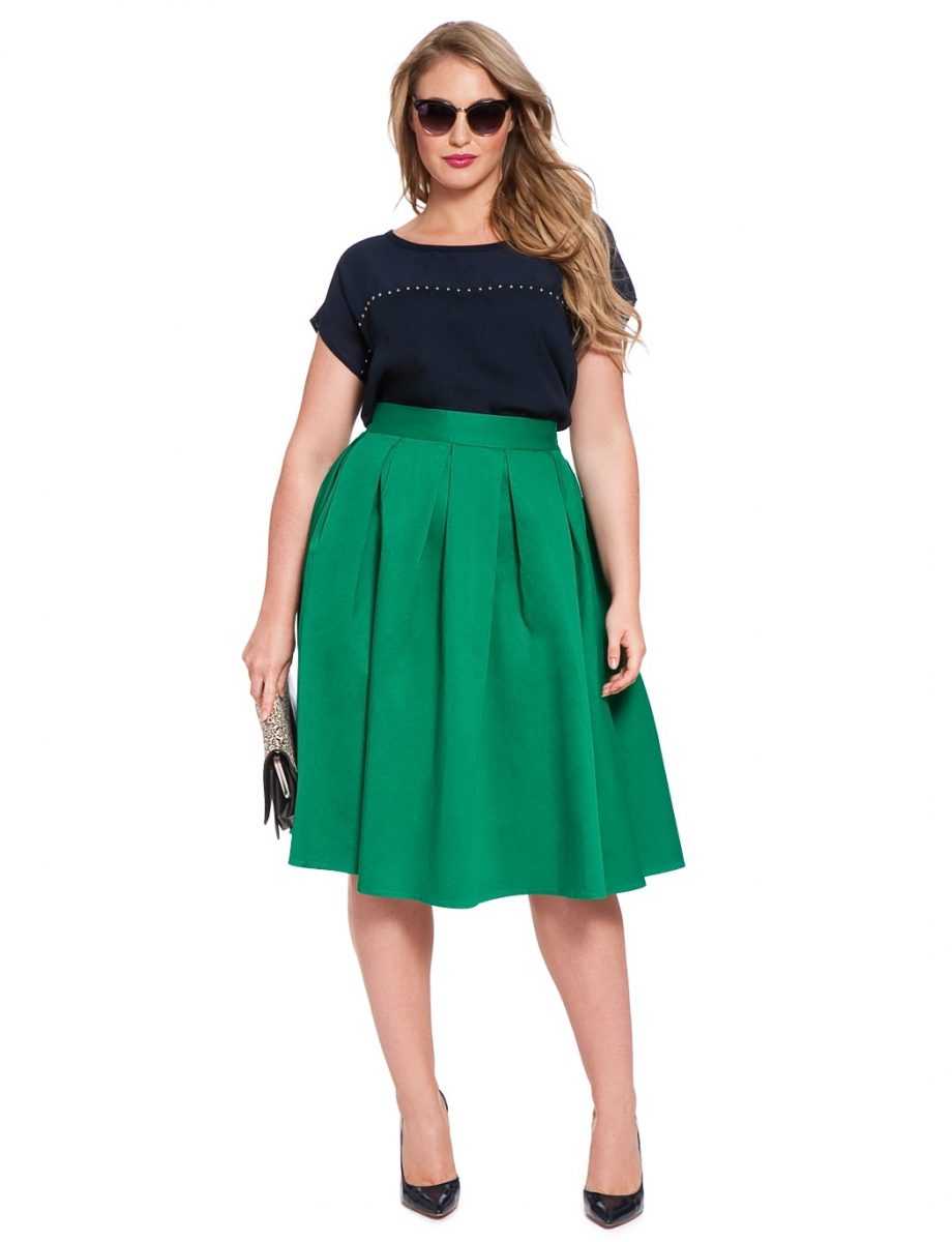 Еще один актуальный фасон юбок для полных – карандаш. Правильная длина – ниже коленной чашечки, правильная ткань – без люрекса и блеска (то есть, матовые варианты). Такие виды юбок можно носить и в офис, и на свидание, и на особенное мероприятие, меняем лишь верх на более нарядный. Если вам неудобно ходить на каблуке – выбирайте под такие юбки обувь на платформе. Полные девушки могут смело под юбку надевать темные колготки (они отлично стройнят ноги), но обувь тогда должны быть только темной.