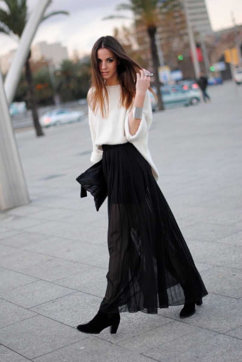 Особенность этого года в том, что складки стали более крупными, выразительными, а материал плотный, фактурный. Подчеркните юбку намеренно небрежным свитером – вязанным, oversize – не забывайте про броские аксессуары и звание королевы стиля Ваше! Для юбок из шифона и органзы выбирайте нежные, натуральные оттенки: бежевый, розовый, светло-зелёный, голубой. Они подходят практически всем. Но если хотите придать своему образу загадочности – наденьте прозрачную юбку чёрного цвета