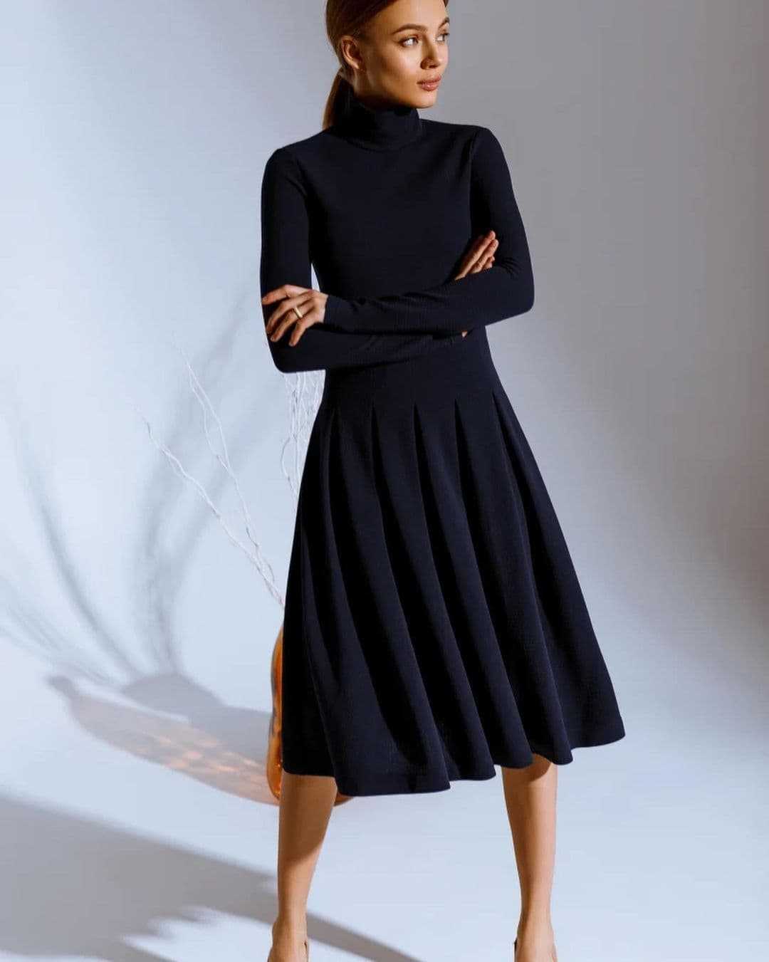 - Идеальное платье с плиссировкой выглядит следующим образом: собственно сама плиссированная юбка, длинные рукава с манжетами, закрытая грудь и горловина.