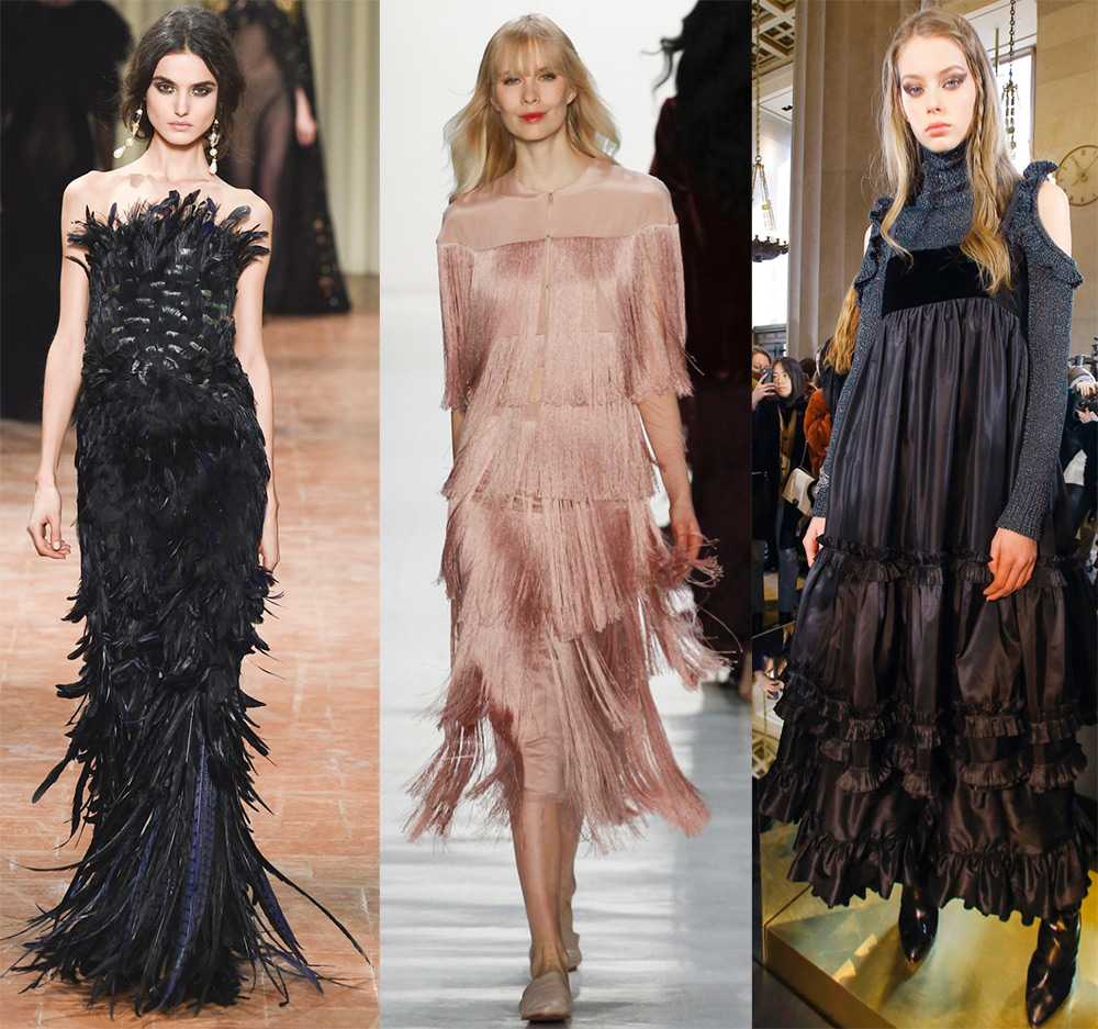 Практически в каждой коллекции именитых дизайнеров таких, как Alberta Ferretti, Valentino, Elie Saab, Michael Kors присутствуют красивые платья для особых случаев с отделкой из перьев. Такая отделка чаще используется фрагментарно, например, для декора подола юбки или рукавов, реже покрывает все изделие целиком. Особой популярностью будут пользоваться модели, в которых сочетаются гладкий текстильный лиф и пышная юбка из крупных перьев.
