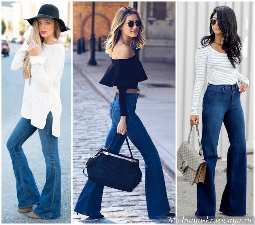 Нужно отметить, что в последнее время модельеры тяготеют к стилю ретро: на подиумы снова вернулся тренд прошлых сезонов – джинсы — клеш. Они непременно должны быть ниже щиколотки и носить их стоит только с каблуком или платформой.
