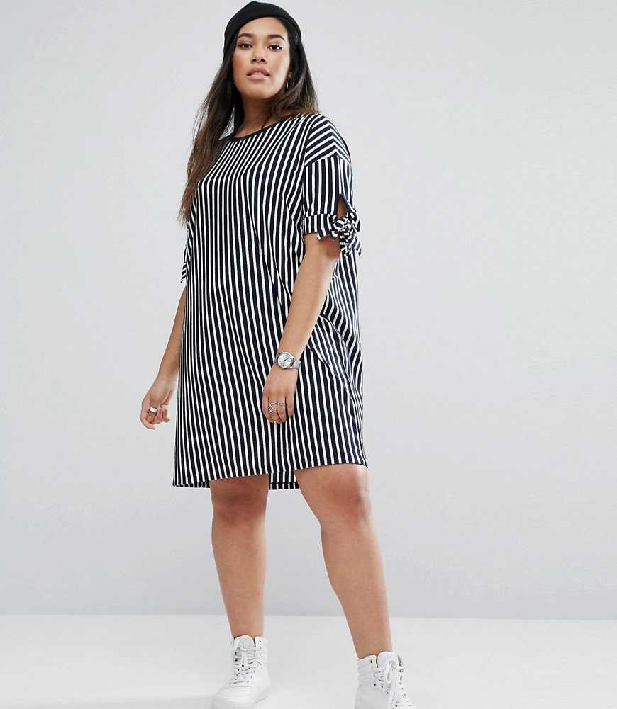 Контрастные вертикальные акценты визуально вытянут фигуру, асимметрия «размоет» контуры бедер, а сдержанный декор в районе груди отвлечет внимание от проблемных зон. Оверсайз дополняют лаконичным низом, свободную футболку-платье – только обувью и украшениями