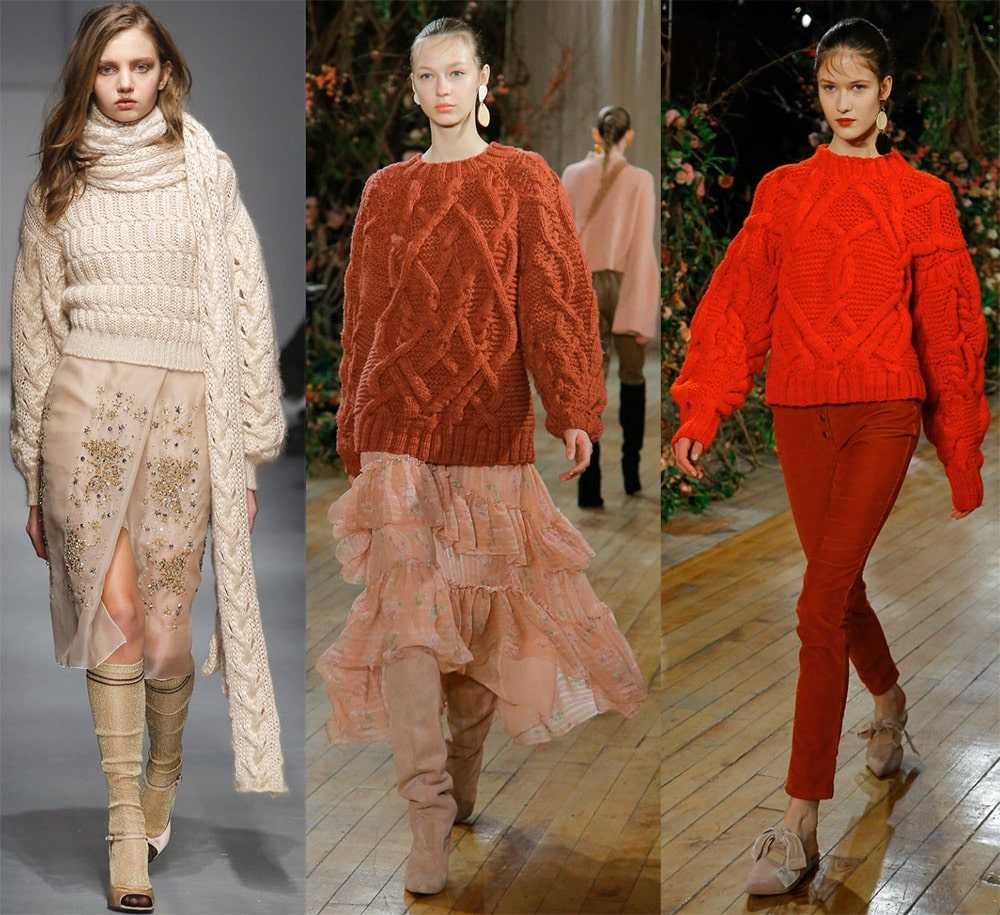 Особенно внимание привлекают модели крупной вязки с ромбами и широкими рукавами