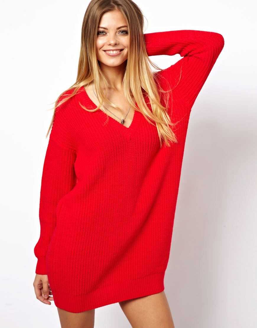 V-образный вырез – прекрасно подойдет тем дамам, что хотят визуально удлинить шею и вытянуть фигуру. В паре с расклешенной юбкой, свитер отлично скорректирует фигуру: ноги будут казаться длиннее и стройнее.