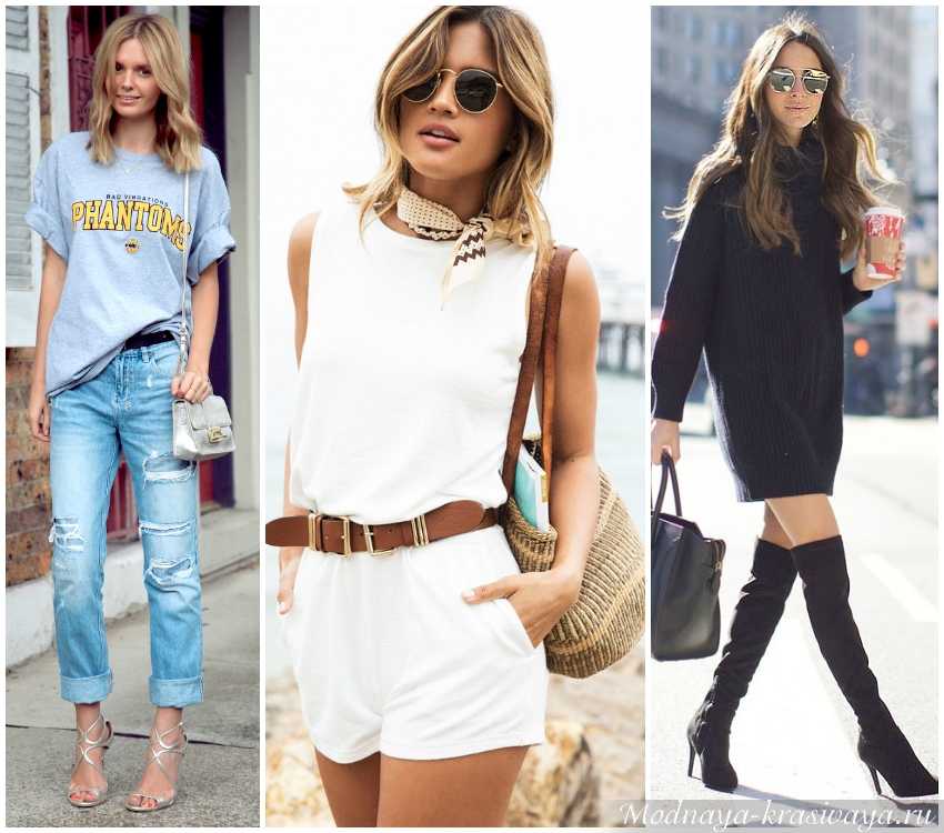 - Главное в одежде – указать взглядам на верхнюю часть туловища, но не открывать при этом его, так что топы на бретельках и с открытыми плечами сюда не подойдут. Лучшей длиной будет ниже талии.