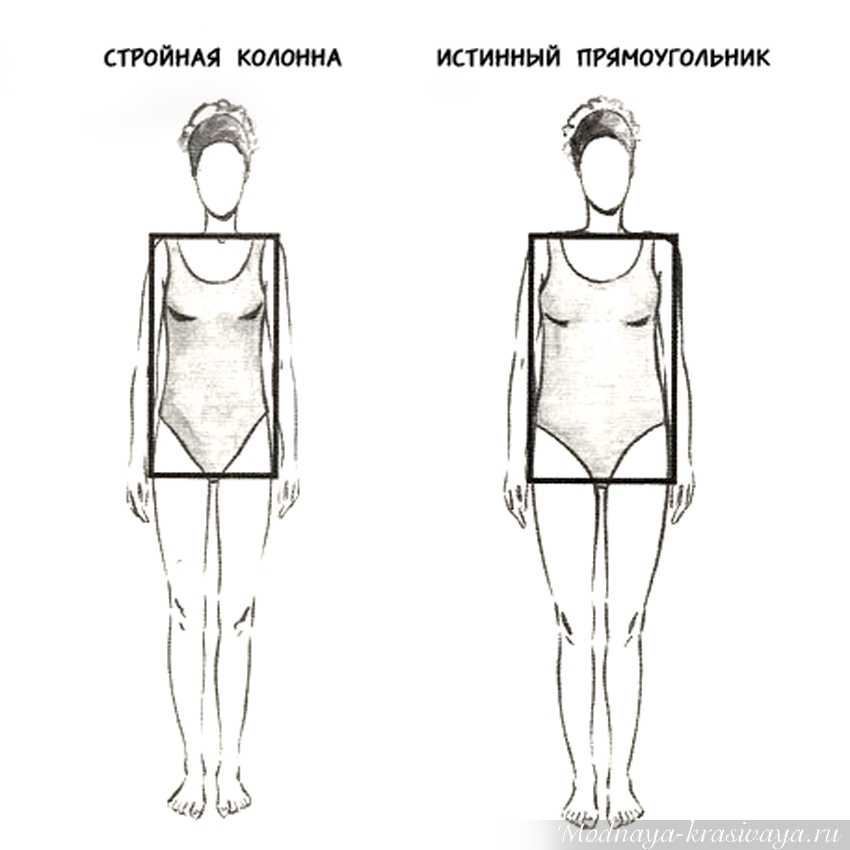 Тип фигуры «прямоугольник» — это тип, который трудно определить, лишь взглянув на человека. Однако, есть несколько факторов, которыми можно орудовать, чтобы определить тип фигуры. У «прямоугольника» ширина плеч схожа с шириной бедер, а также почти равна ширине талии, отчего и пошло такое название, ведь обладательницы такой фигуры будто бы «вылеплены» из прямоугольника. Однако, у женщин с таким типом фигуры будут всегда стройные и прямые ноги, особенно без явных признаков «ушек» на бедрах. Однако, сам тип фигуры «Прямоугольник» делится на два других типа: