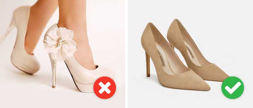 Не приветствуется излишний декор, такой как: клепки, шипы, стразы, цветы, цепи, кружево. Если желаете «праздника», лучше выбрать яркий цвет или каблук необычной формы.