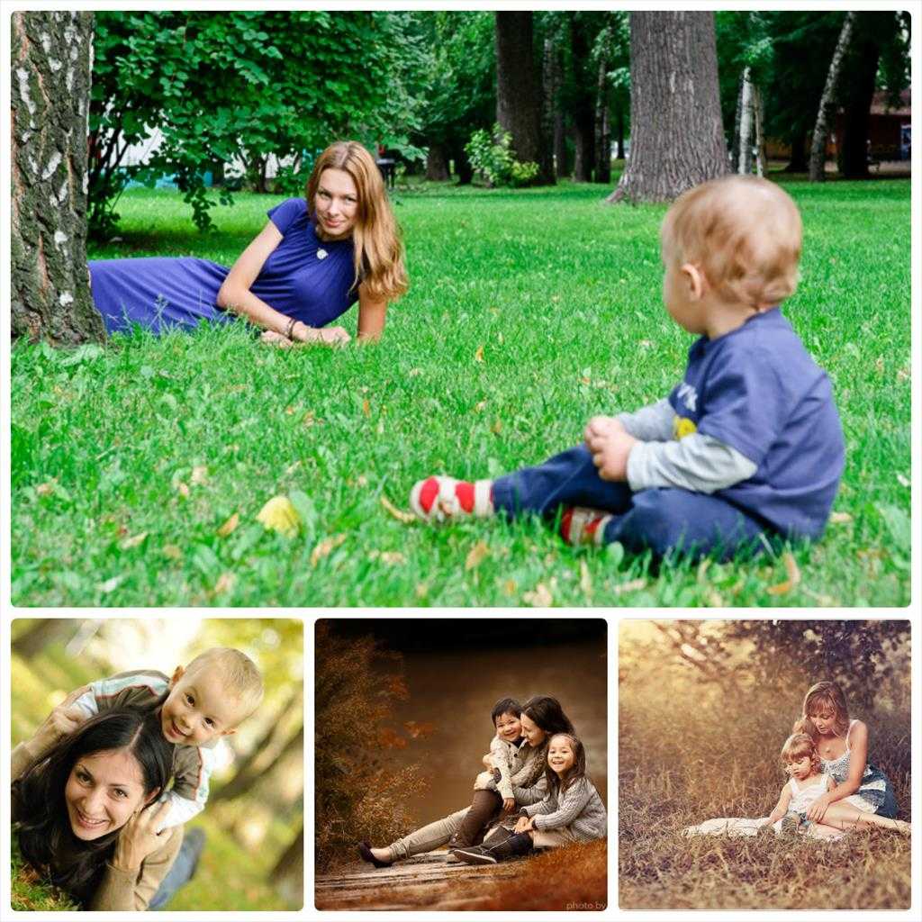 Для фотографирования мамы с детьми на природе можно выбрать разные места. Это может быть совместная прогулка в парке, детская площадка, вишневый или яблоневый сад, поле подсолнухов или ярких цветов. Декорациями будут служить деревья, трава, водоемы, пеньки и пр.