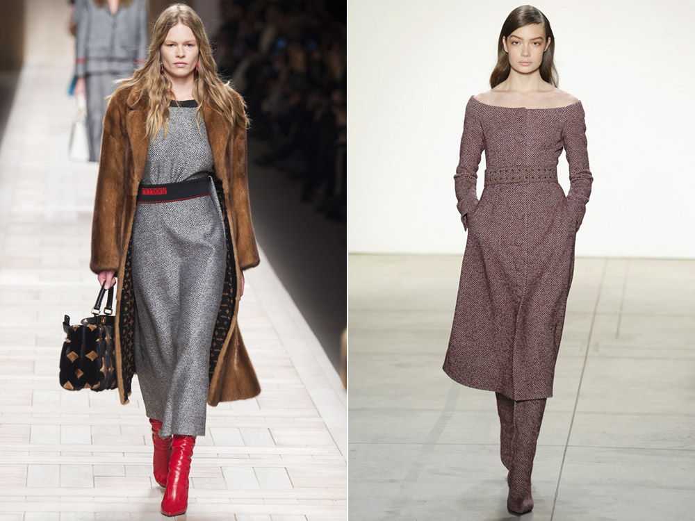 Прохладной осенью и зимой необходимы платья из плотных тканей. К ним относятся костюмные ткани с шерстью, букле, твид. На подиумах встречаются модели в платьях с отделкой из меха. Модельеры предлагают следующие ткани: теплый трикотаж, кружево, матовая кожа, жакард. Погодные условия осенью и зимой заставляют одеть что-то теплое и комфортное. Дизайнеры предлагают на это время года большой выбор платьев, которые, несмотря на более плотный материал, подчеркнут женственность и красоту.