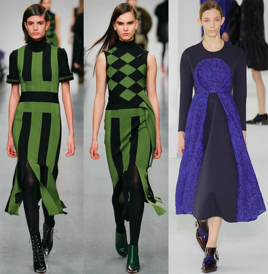 В тренде все проявления минимализма, но во многих коллекциях присутствуют цветочные узоры, объемные вышивки и геометрические принты. Не пропадает мода на платья серых оттенков. Они не такие маркие и делают силуэт более стройным. Великолепно смотрятся модели с контрастными деталями. Это могут быть белые манжеты и черные воротнички.