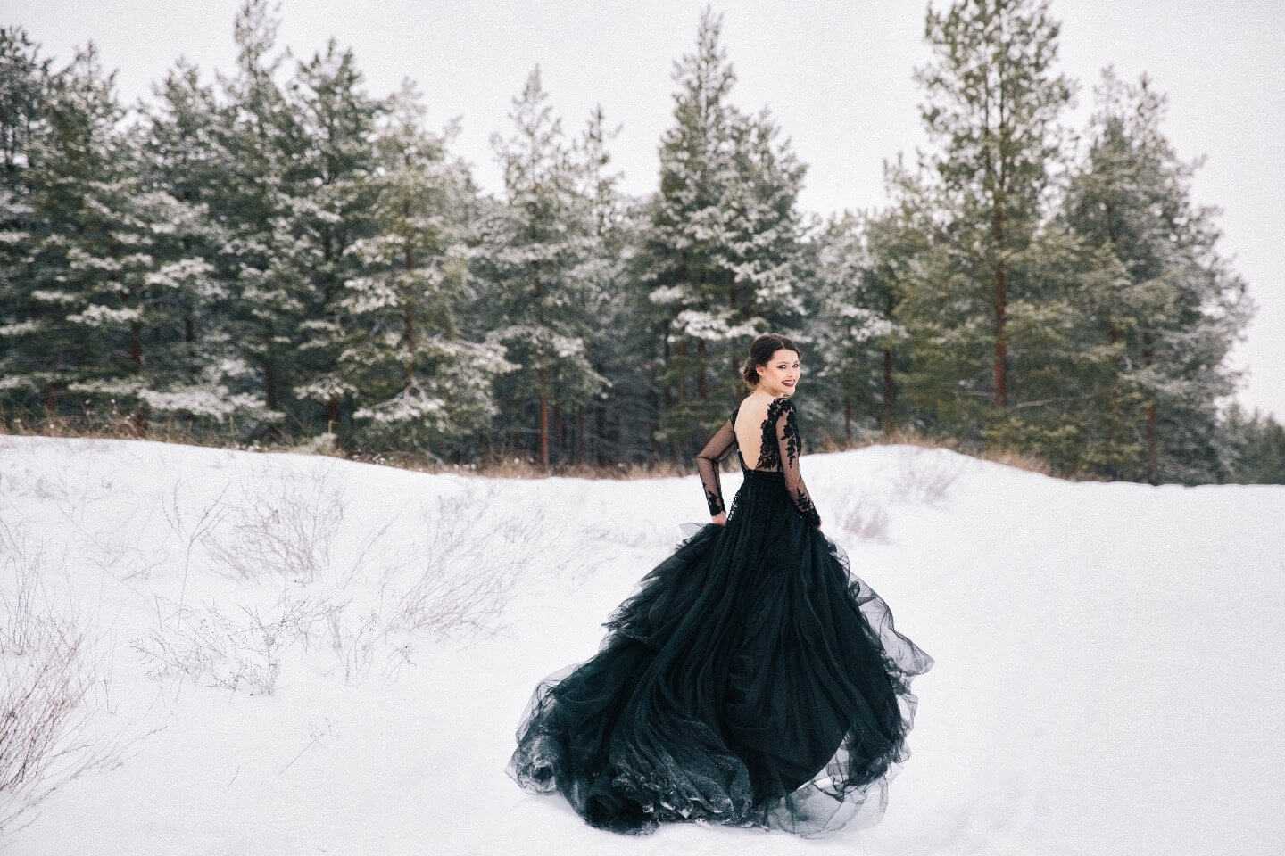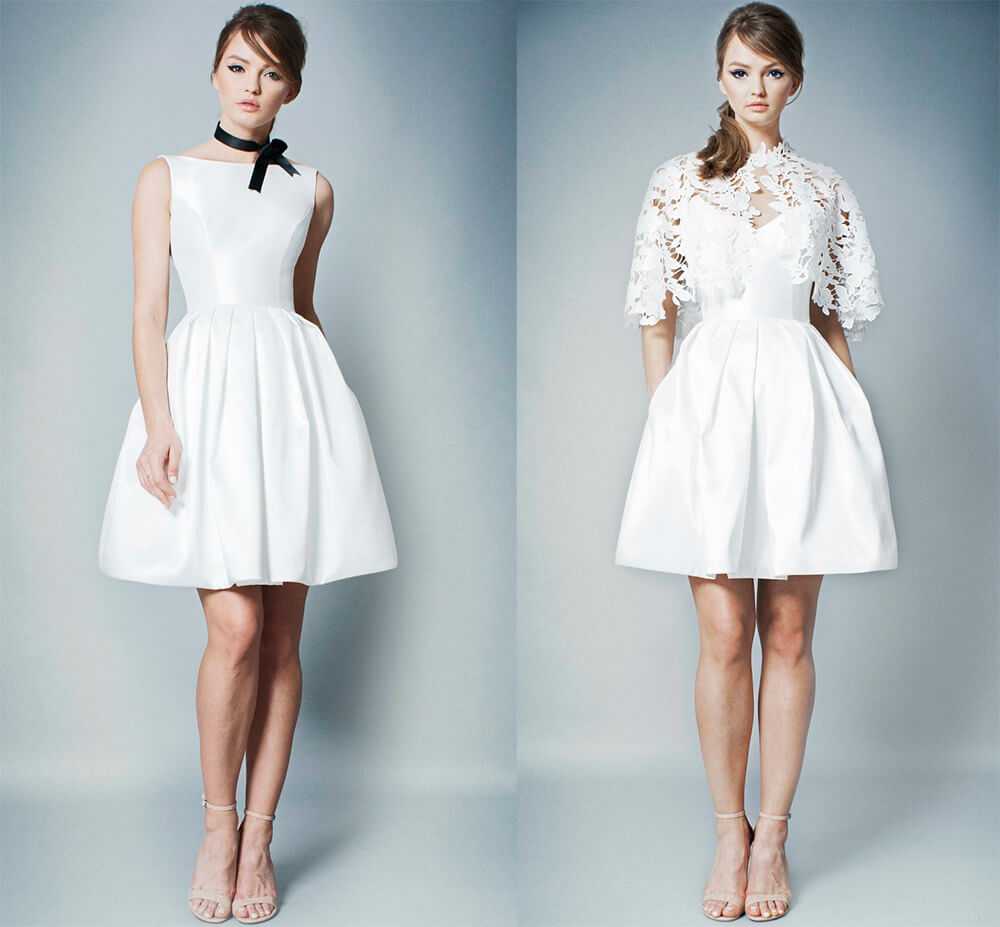 Популярными нарядами в последнее время стали короткие двухцветные свадебные платья. Например, невеста может выбрать традиционную белую модель с чёрной отделкой или вставками другого оттенка.