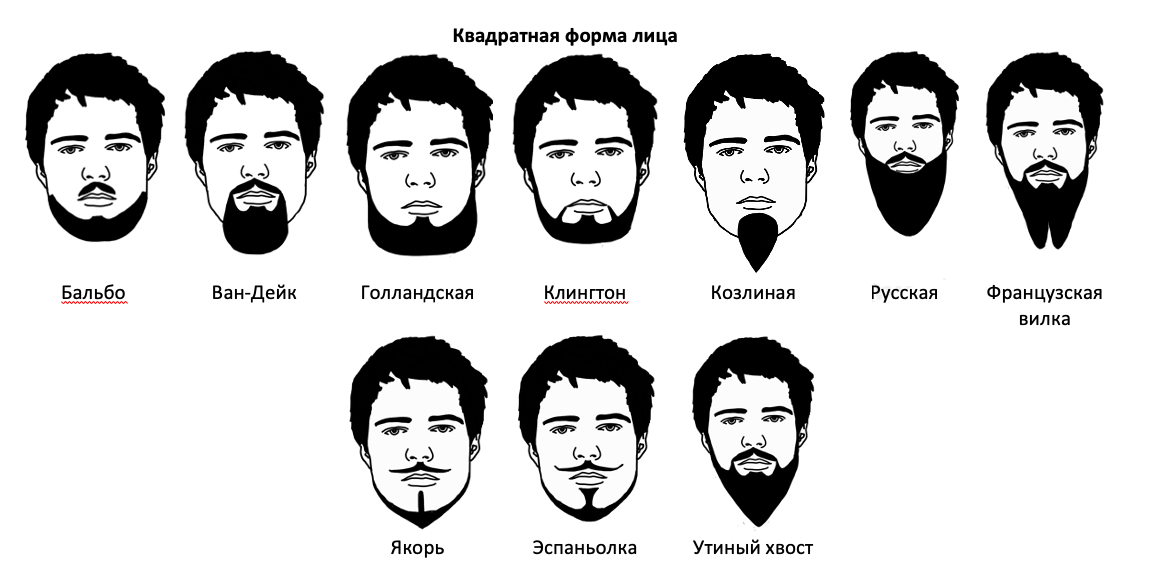 Ромбовидная Подойдет обилие растительности; прекрасно смотрится с модельными стрижками под названиями «росомаха» или «ширма». Квадратная Скорректировать лицо можно с помощью боцманской, скандинавской и норвежской бород. Также гармонично смотрятся все варианты, в которых имеется закругленное основание. Круглая Подходят формы, которые визуально вытягивают контуры лица. В этом случае идеально смотрятся модели типа «французской вилки», «козлиной бородки» и французской бородки. Треугольная Сгладить черты лица позволяют формы, визуально округляющие его или придающие форму квадрата, например, «Гарибальди». Сердцеобразная или грушевидная Смотрятся стильные бакенбарды и легкая небритость в зоне подбородка. Продолговатая (вытянутая) Волоски могут быть короткой или средней длины. Чтобы визуально уменьшить вытянутость, следует постоянно подравнивать их