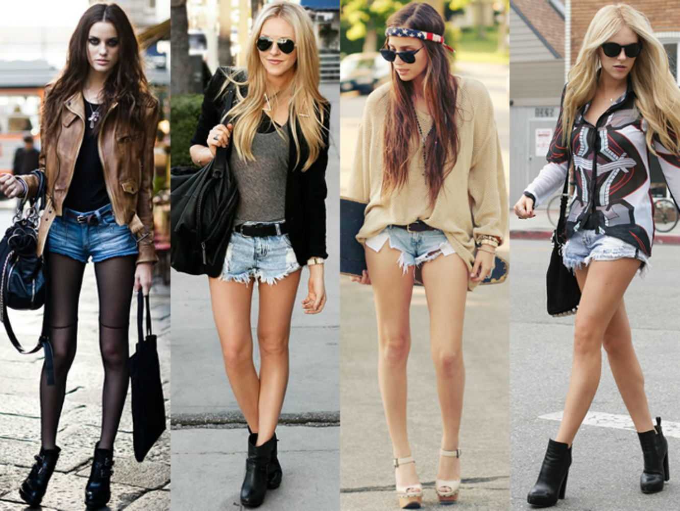 - короткие шорты из джинсы с ботфортами;
