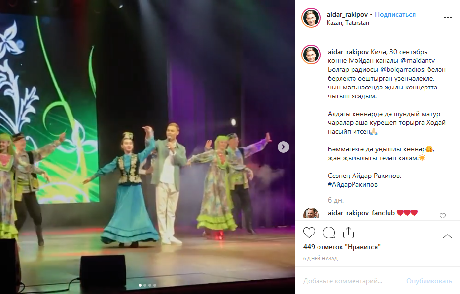 Недавно Айдар провел благотворительный концерт, выступив на сцене Лаишевского районного Дворца культуры. Во время исполнения песен дети, сидящие в зале, поднялись на сцену и сфотографировались с ним. Девочки и мальчики разрисовали фломастерами специально привезенную им одежду, в которой артист потом выступил в Казани на День города.