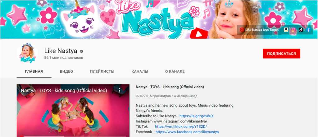 5. Like Nastya — 86.1 миллионов подписчиков