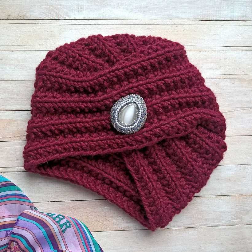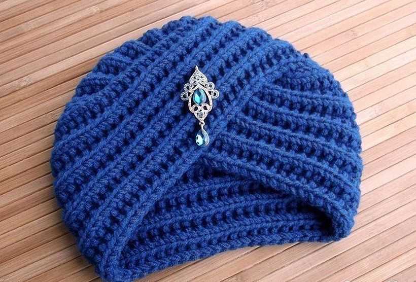 Соединить концы можно при помощи крючка (следует сделать специальный шов). Украшать головные уборы можно при помощи ярких брошек. При желании можно поискать схему вязания чалмы крючком.