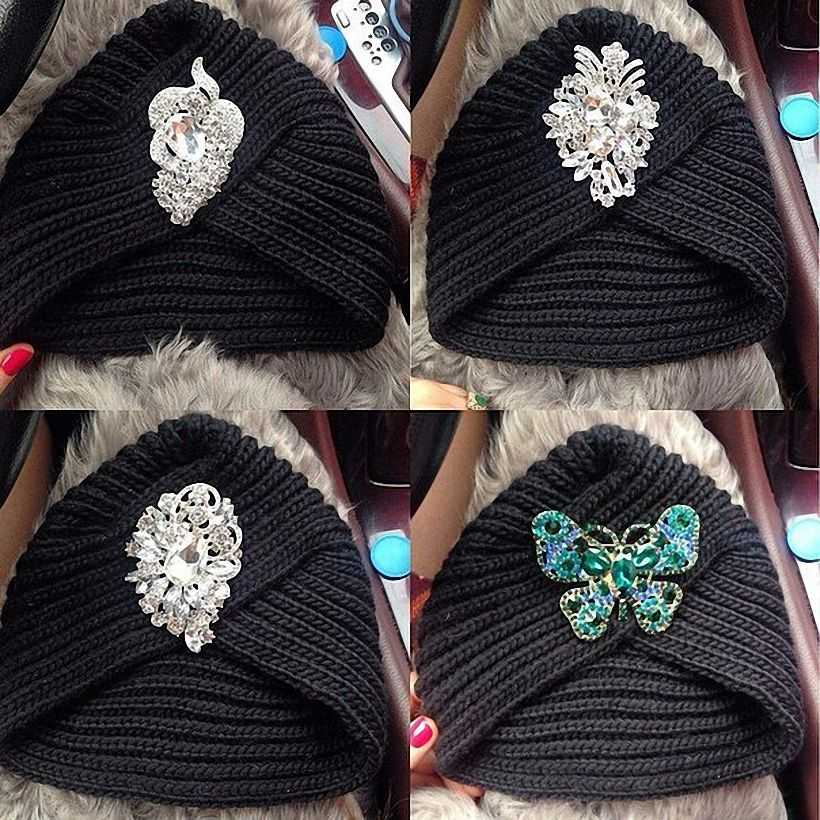 После этого переходим к декорированию передней части. Здесь нам понадобится красивая брошь с большими кристаллами. Её мы располагаем по центру нашего изделия. На фото вязаной чалмы изображены лучшие варианты аксессуара.