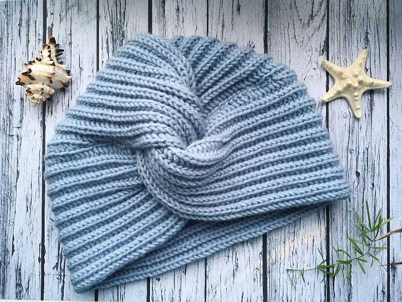 В модных журналах можно увидеть фото вязаной чалмы. Основным узором считается резинка четыре на четыре. Поэтапная инструкция вязания тюрбана резинкой:
