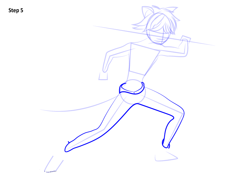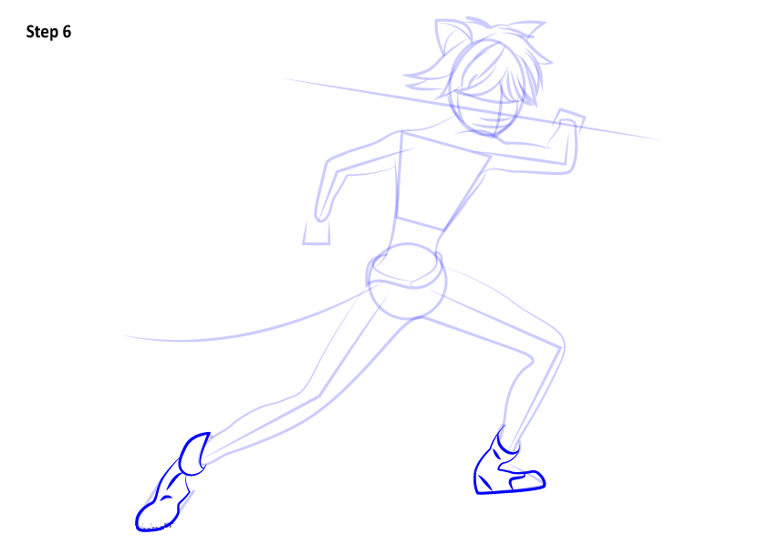 - По ним карандашом будут воссозданы туловище, ноги и руки Леди Баг. Данные штрихи в дальнейшем необходимо будет удалить, поэтому рисуйте их тонкими, карандаш желательно взять мягкий.