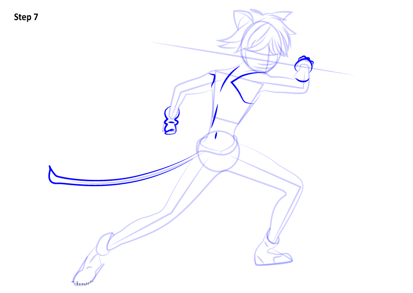 - Придайте объема его рукам и ногам. Обут наш герой в ботинки, протекторы на подошве которых, кстати, имитируют кошачью лапу. На его талии Супер-Кота есть пояс, продолжением которого и является хвост. Руки с острыми коготками (хотите, изобразите и их на рисунке) одеты в перчатки. А на запястьях парня нужно нарисовать напульсники.