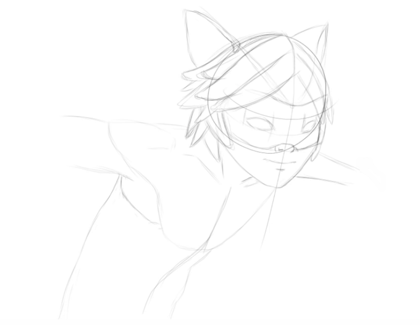 Линиями наметьте руки и ноги Супер-Кота, сделайте углы там, где будут локтевые и коленные суставы. Не забудьте, что у Супер-Кота еще есть хвост, набросайте и его каркас. - Прорисуйте прическу, уши, маску и черты лица героя.