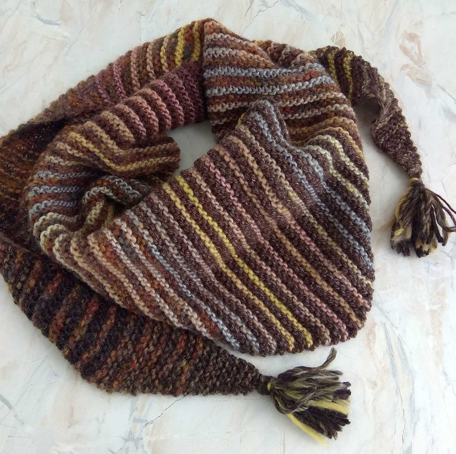 Вся сложность вязания этого головного убора заключается в достижении формы равнобедренного треугольника. Этого можно добиться несколькими способами.