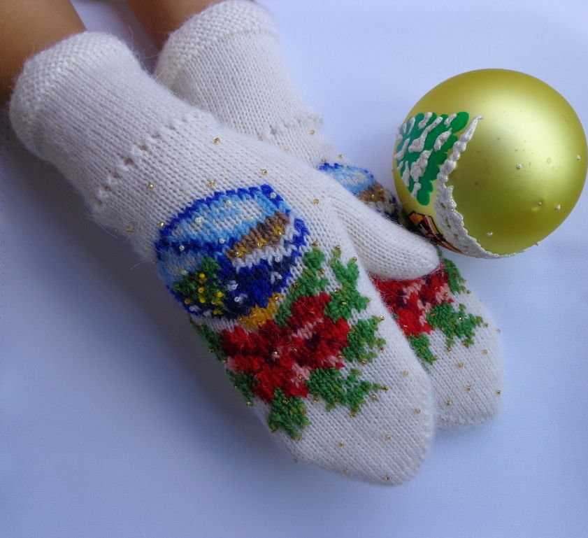В качестве декора для женских рукавичек рекомендуется нечто более утонченное, изысканное. Стразы и бисер на варежке способны подчеркнуть стиль своей обладательницы. Они фиксируются, как правило, посредством использования клеевого пистолета. А вот вплетенная атласная лента создаст элегантный образ. Популярным вариантом декора являются помпоны и цветочные композиции.