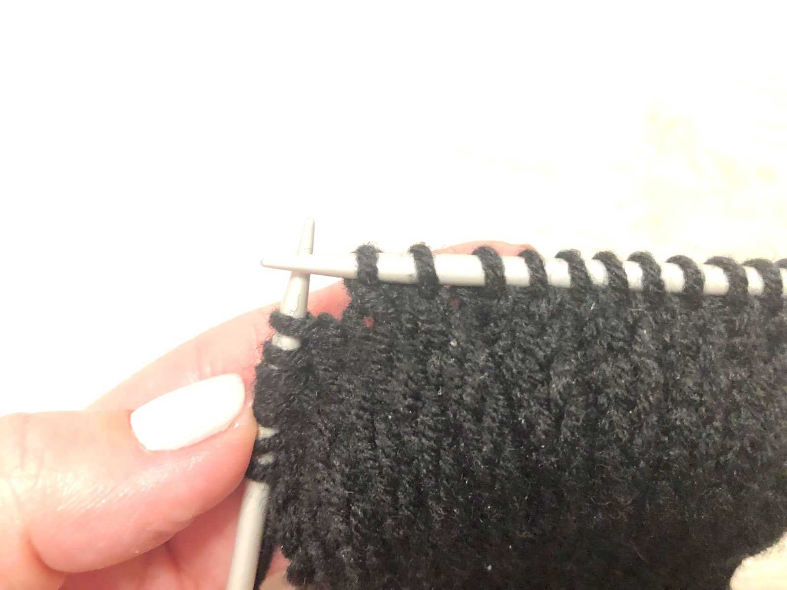 Разворачиваем вязание и вяжем лицевыми петлями 10 петель на одну спицу и 10 петель на вторую спицу.