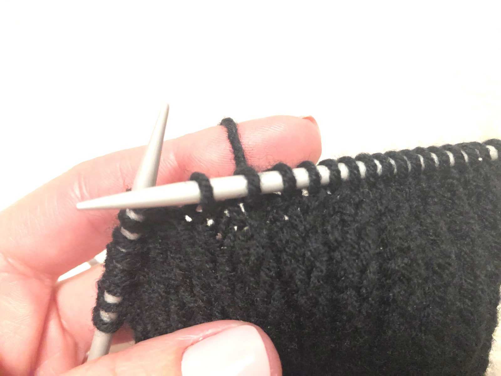 Далее свяжем резинку 1 х 1: то есть будем чередовать одну лицевую петлю с одной изнаночной до конца ряда. Всего нужно провязать 33 ряда.