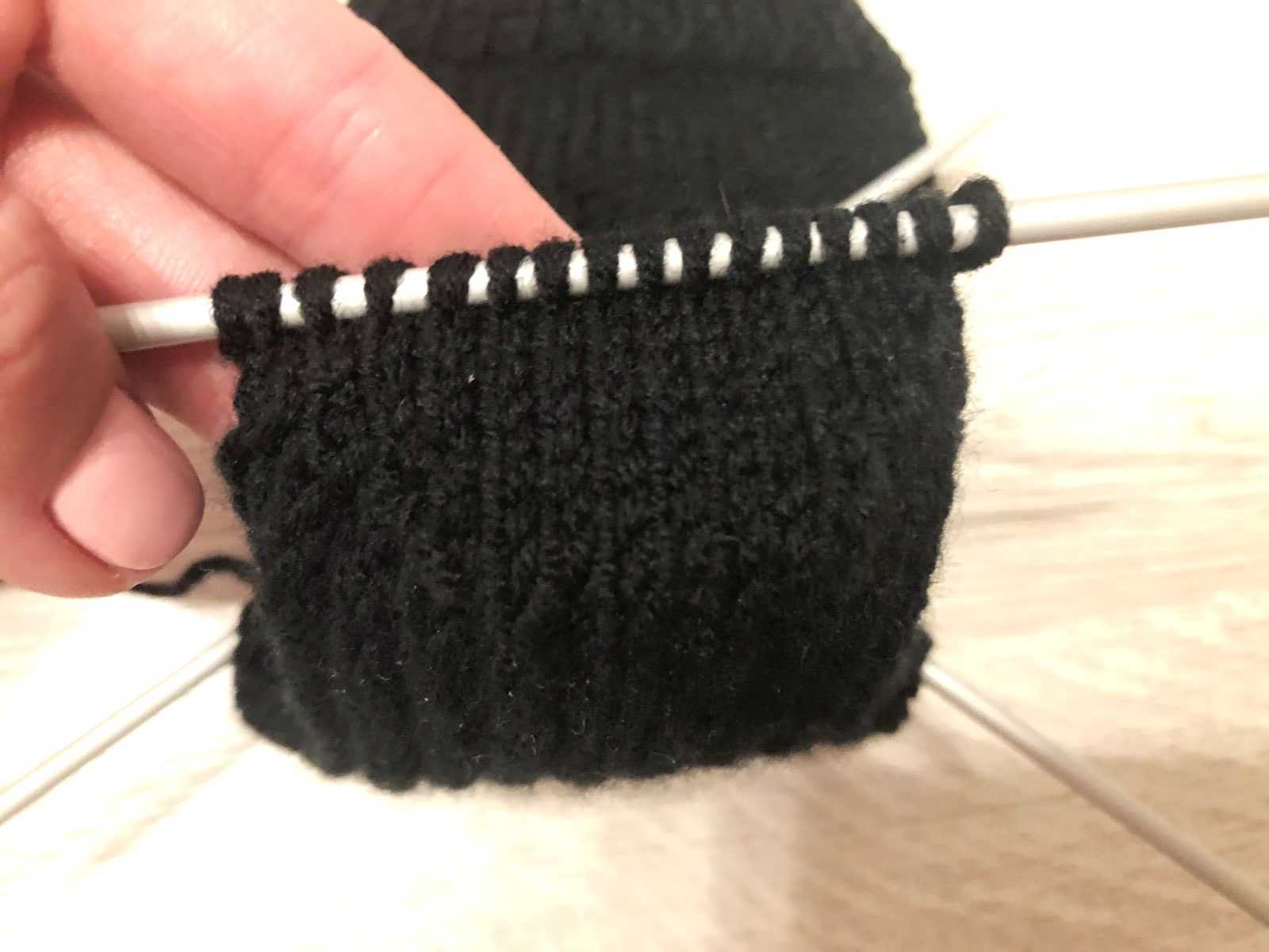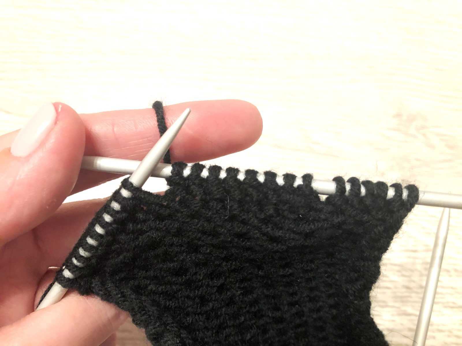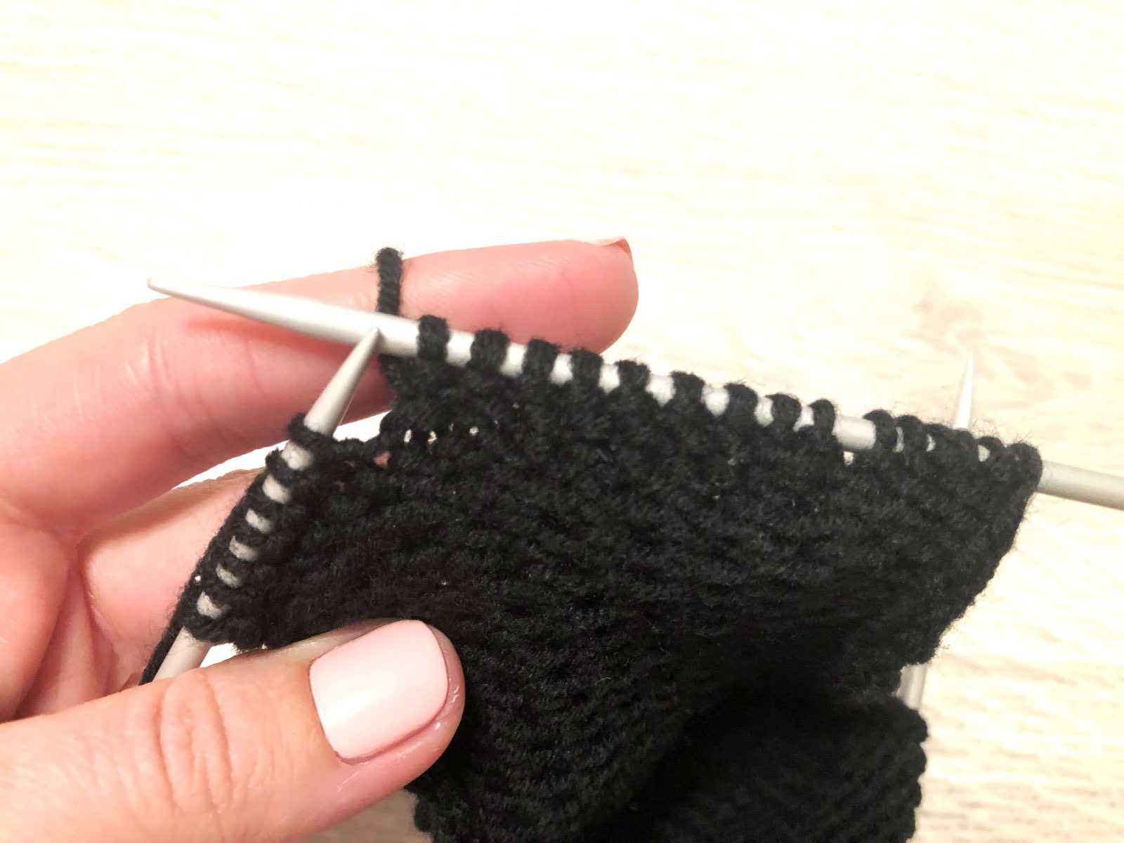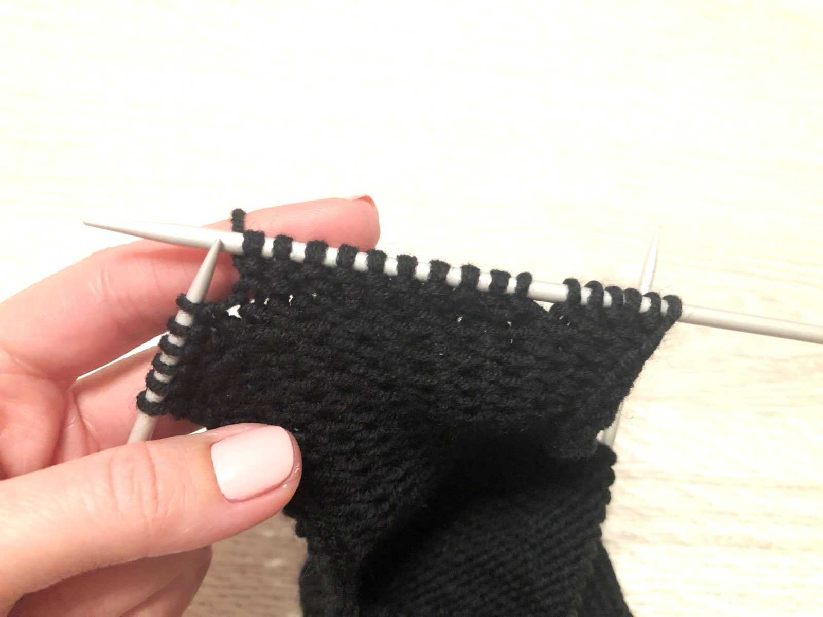 Чтобы вернуться к круговому вязанию необходимо донабрать из стенок пятки нужное количество петель. То есть исходя из расчета выше по 10 петель с каждой стороны.
