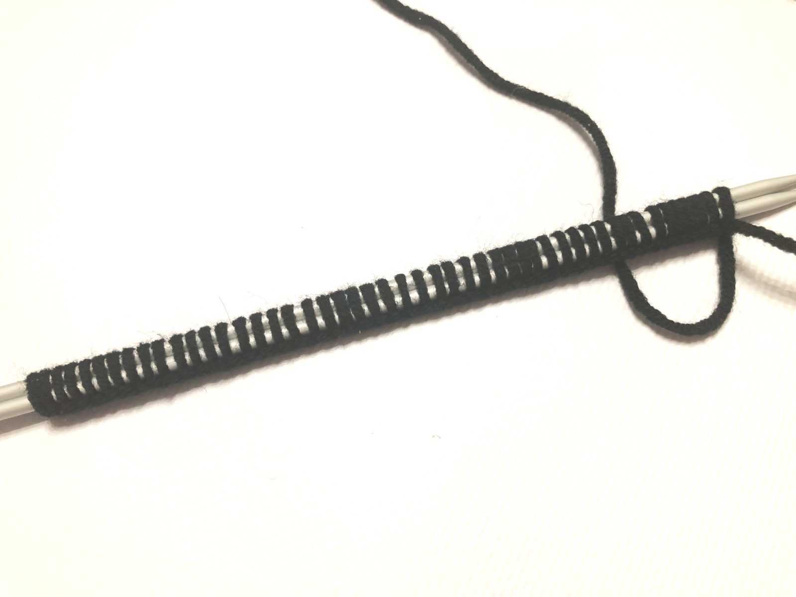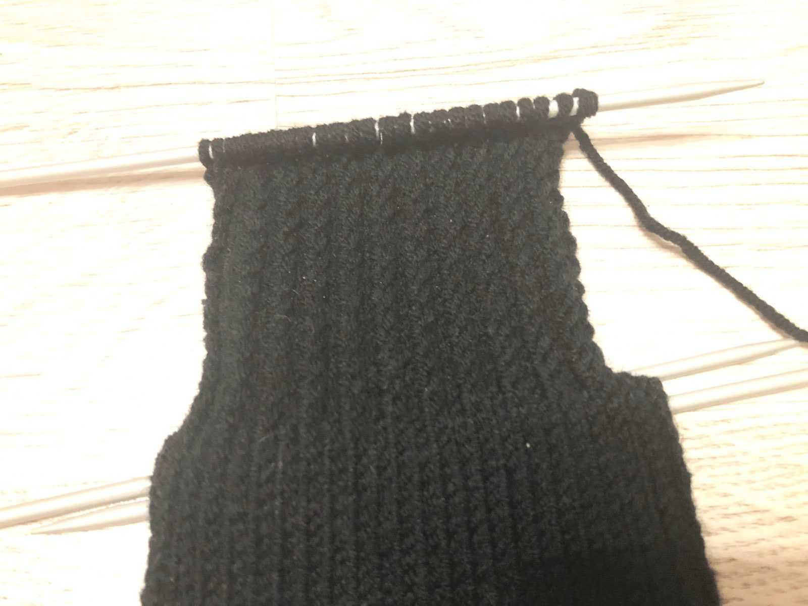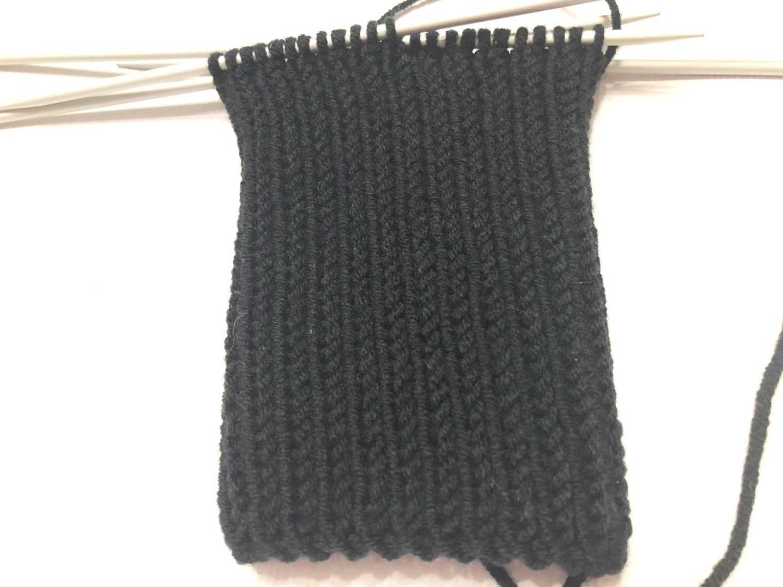 - Вяжите резинкой 2х2 (2 лицевых, 2 изнаночных) 3 ряда. Нить не обрывайте, иначе придется делать узлы.