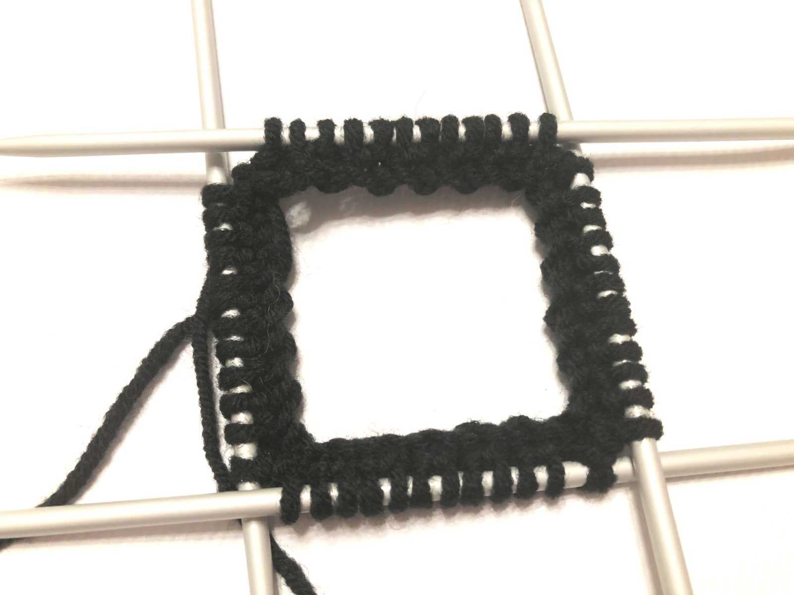 - Нить, которая осталась от набора вспомогательного ряда, связать в узел с рабочей нитью. Круг замкнулся – кромочных нет.