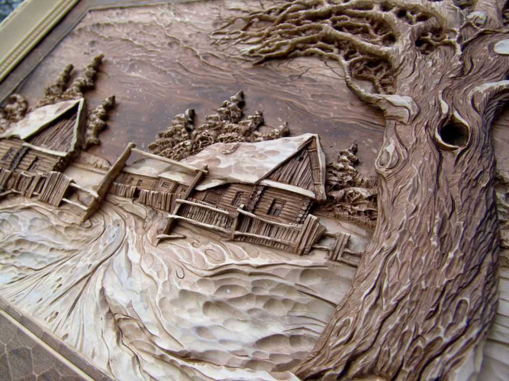 Резьба по дереву представляет собой надрезание и подрезание деревянного материала. В результате из-под ножа резчика выходят готовые контурные рисунки. Очертания предметов, пейзажные композиции, цветочные коллажи находят свое воплощение преимущественно в деревянных панно.