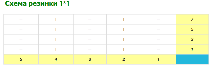- Первый рядок такого рисунка провязываем обычной резинкой 1х1, чередуя лицевые и изнаночные петельки.