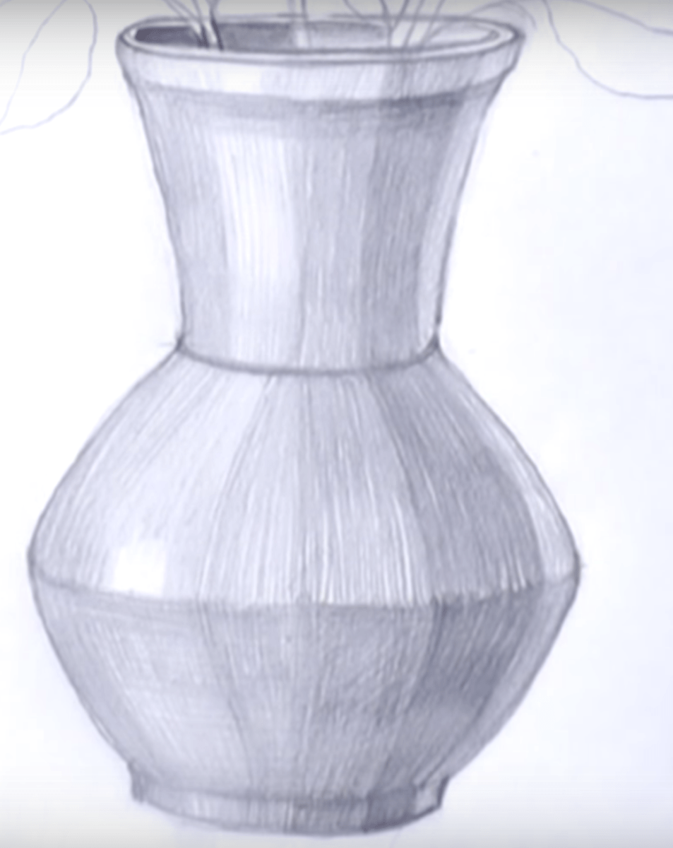 Чтобы нарисовать объем вазы, сначала нужно рассчитать, какая сторона светлее. После этого мягким карандашом создаются тени. Это очень легко представить.