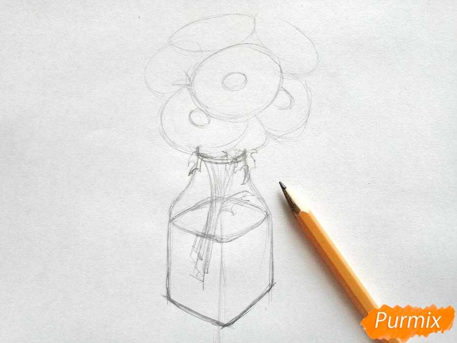 Прорисуем стебли ромашек в вазе и под водой. Несколько листьев будет свисать с горлышка вазы. Очертим общую форму каждого цветка в форме овала и добавим серединку. Некоторые цветы будут спрятаны за друг другом.
