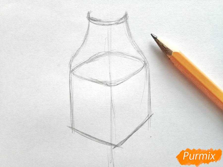 Продолжаем прорисовывать вазу. От середины вазы сужаем линии, чтобы образовалось узкое горлышко. Ваза будет наполовину наполнена водой. Нарисуем её поверхность. Ваза будет немного похожа на форму бутылки.